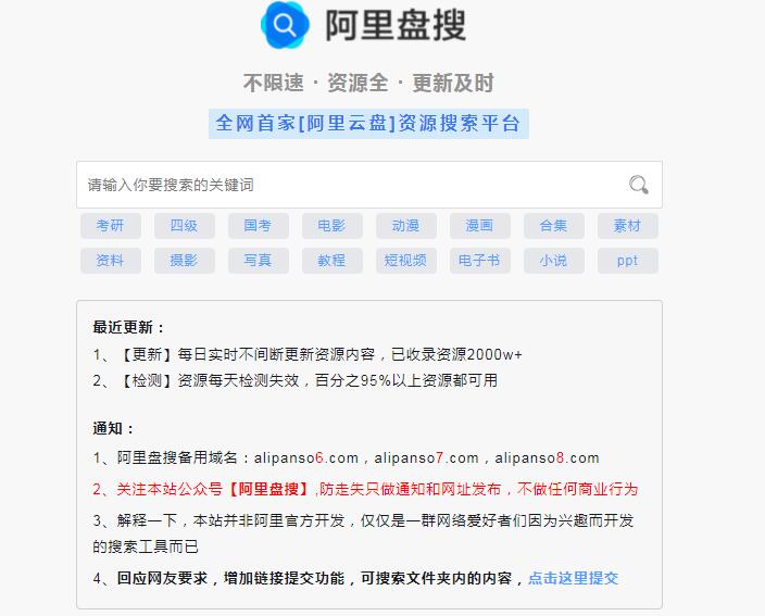 在线阿里云盘资源搜索站 暂无评论 时间:2021年12月7日,作者:share1223.com 今天,分享两个。 https://www.alipanso.com/ https://www.niceso.fun/ !本站的分享来源网络,版权属于原作者。严禁用于任何商业目的,仅供学习参考,如有侵权联系邮箱。